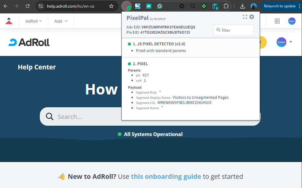 If you are able to see pixel detected is 2.0, then it confirms that you are using the latest version of our pixel (V2). If it is blank, it should be the older version of the AdRoll Pixel (V1).