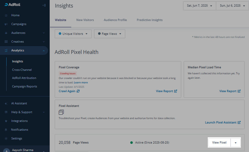 - Scroll down to AdRoll Pixel and click View Pixel.