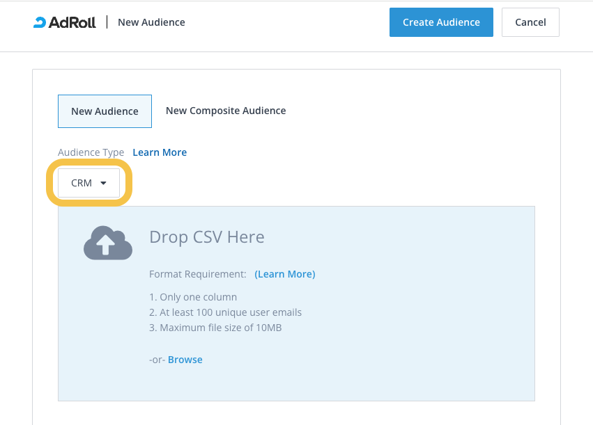 CRM Audiences allow you leverage your own first-party customer data for highly targeted and effective advertising. While we recommend integrating your B2C CRM to AdRoll to dynamically sync your email lists through Connected Audience, you can also create a CRM Audience manually by uploading a static CSV file containing email addresses. This allows you to bridge the gap between your customer database and your advertising campaigns.