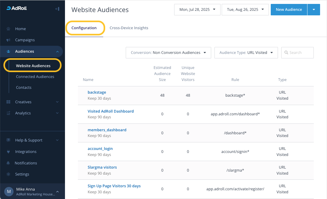 Once your CSV file is ready, log in to AdRoll and navigate Audiences > Website Audiences to on the left menu.