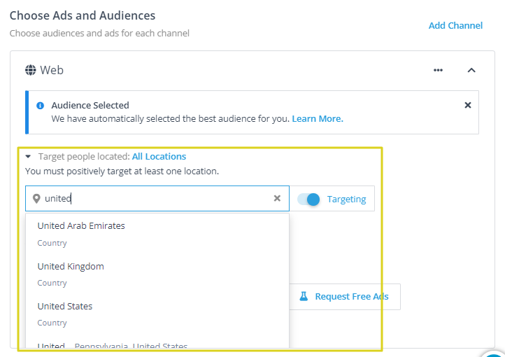 When creating a new campaign you will be prompted to choose the location of your target audience.
