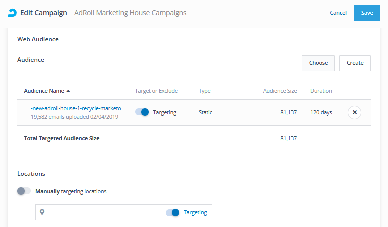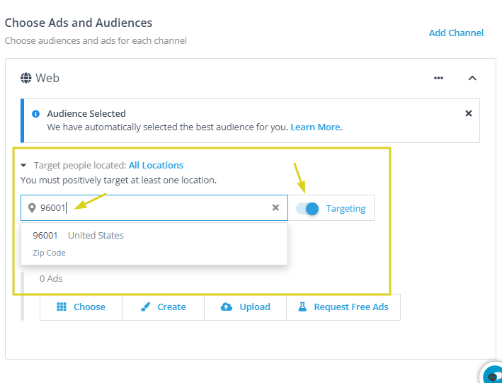- Under the Web Audience section, enter a location to either Target or Exclude.