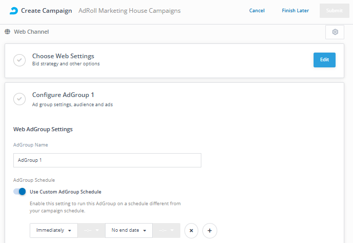 Toggle to use Custom AdGroup Schedule and enable this setting to run the AdGroup on a schedule different from your campaign schedule.