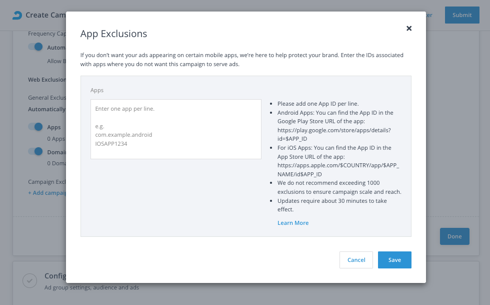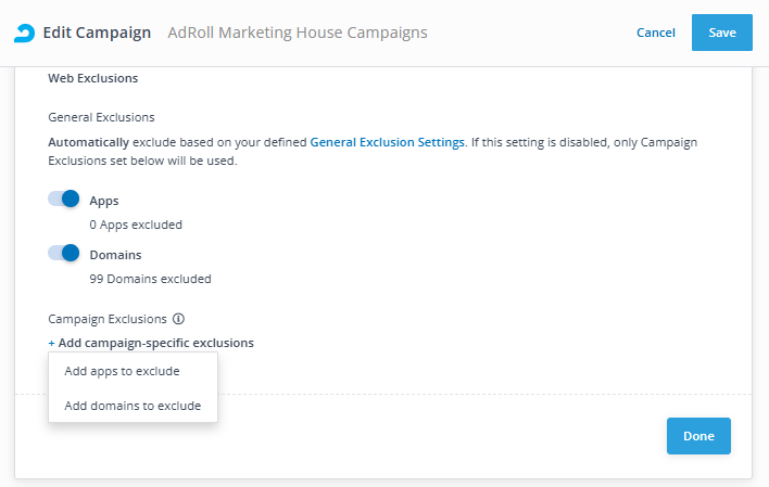 Under Campaign Exclusions select Add apps to exclude or Add domains to exclude .