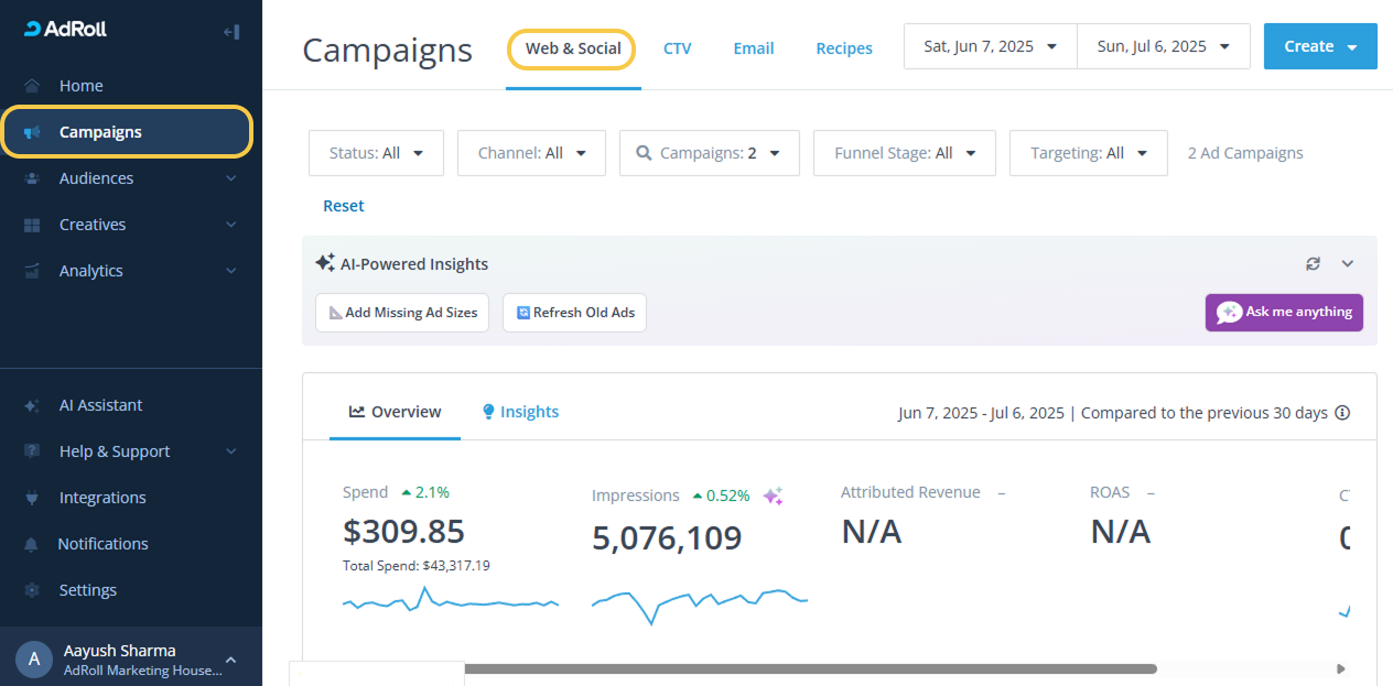 - Log in to AdRoll and navigate to Campaigns on the left side menu.
