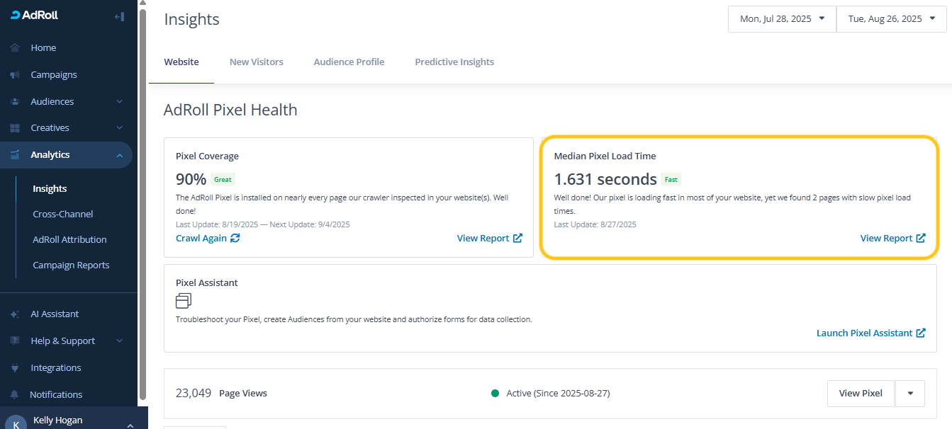 The Median Pixel Load Time card is a quick tool that helps you understand how fast the AdRoll Pixel is loading on your website, as well as which pages have slower load times.