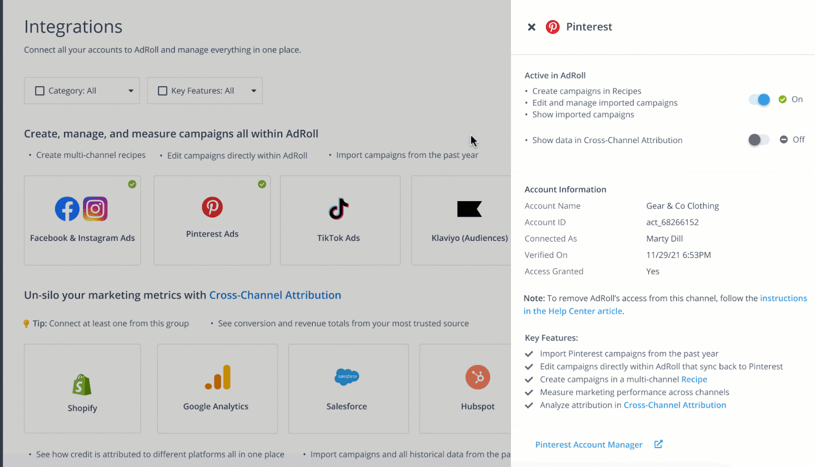 Tip: Have a change you want to make in your Recipes or campaigns after seeing the data in the Cross-Channel dashboard? You can easily access, resume or pause AdRoll, Facebook, TikTok and Pinterest campaigns directly from the dashboard to make editing quick.