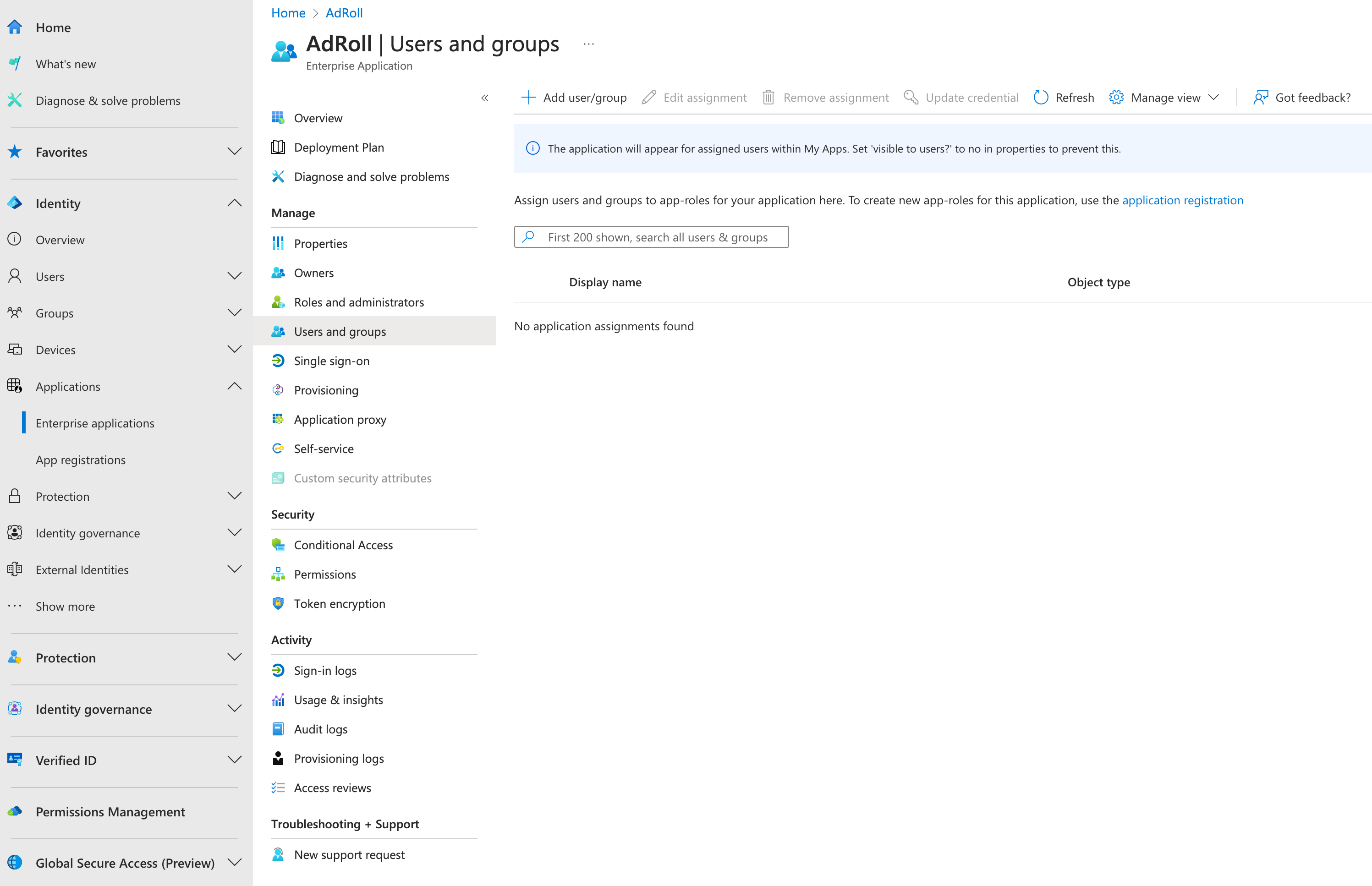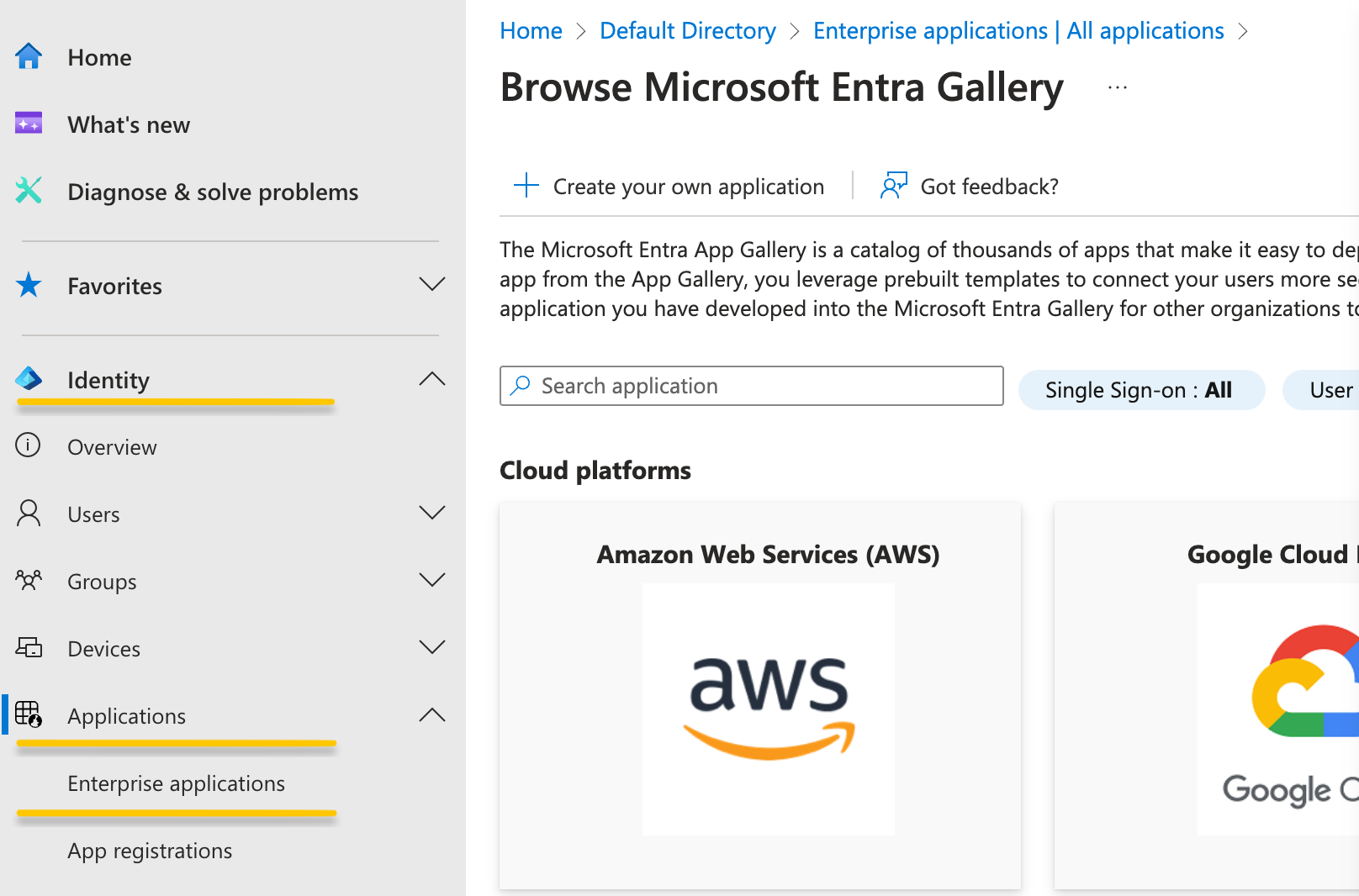 - In Microsoft Entra ID, navigate to Identity > Applications > Enterprise Applications