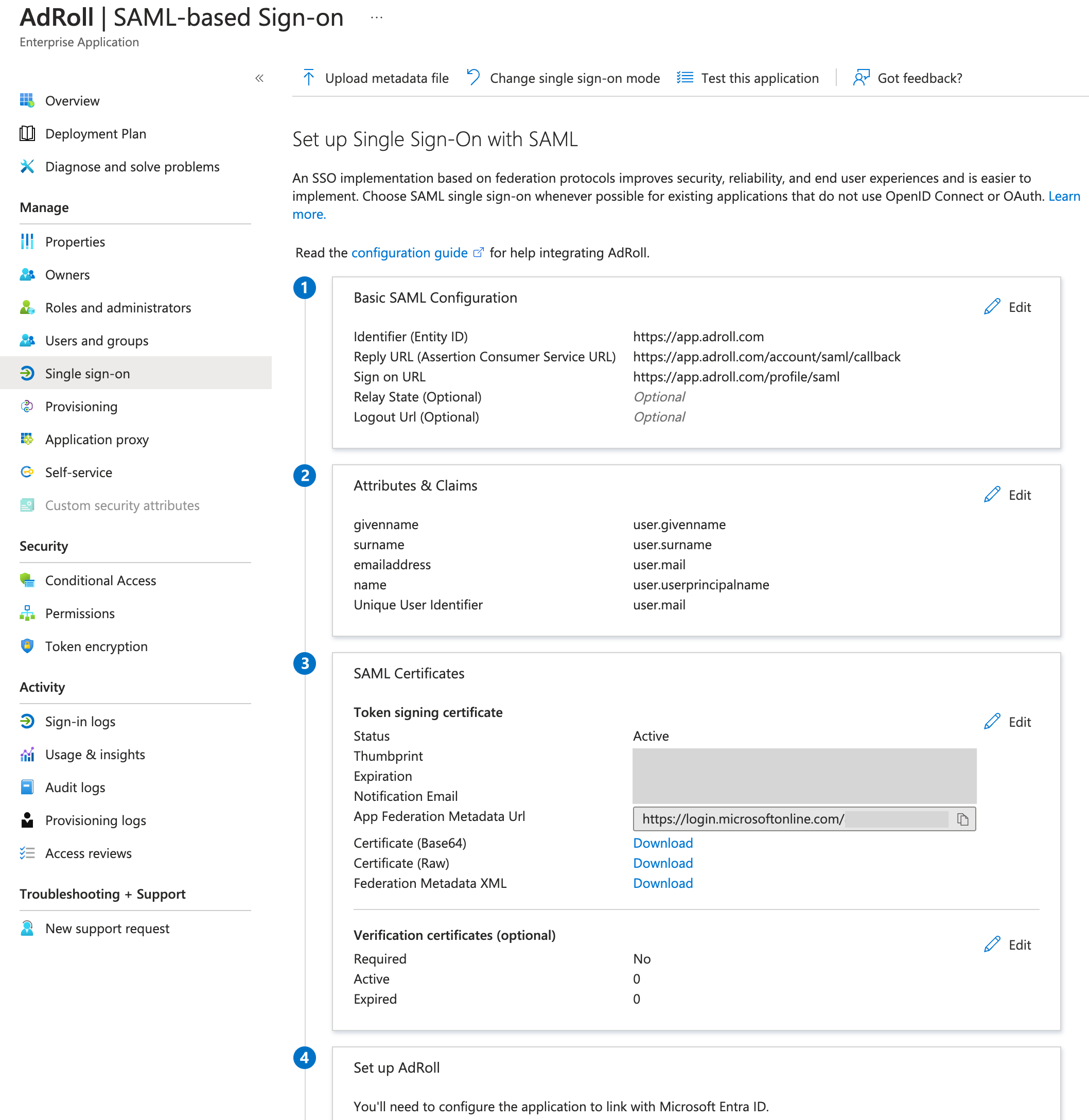- Confirm with your IT department that Microsoft Entra ID is integrated with AdRoll.