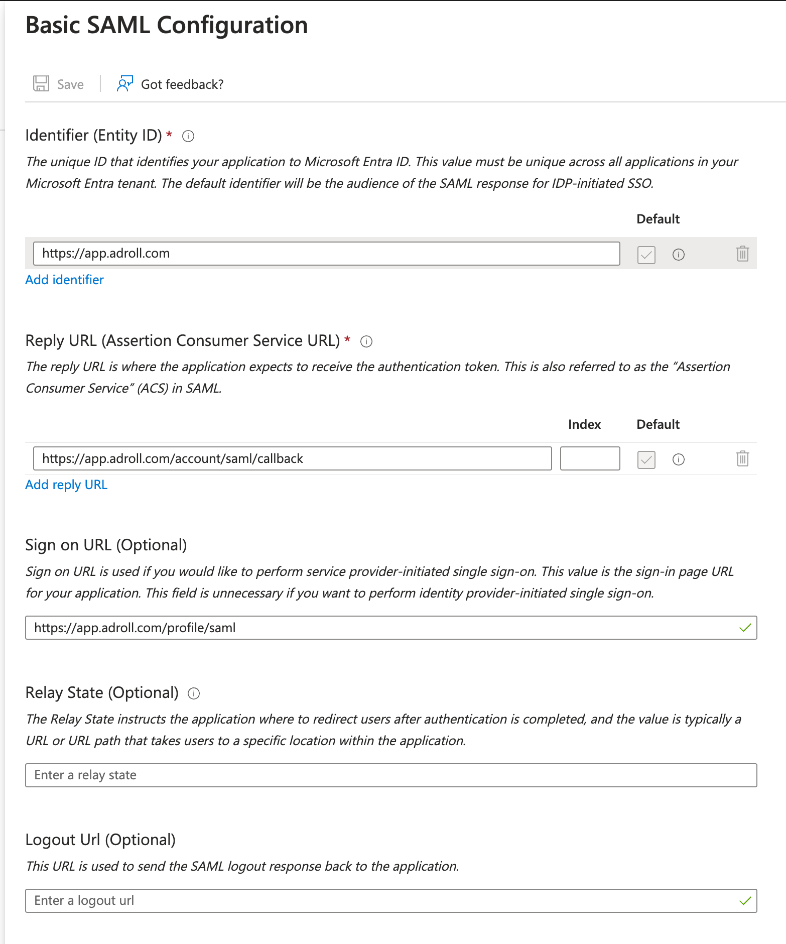 | Reply URL (Assertion Consumer Service URL) | https://app.adroll.com/account/saml/callback |