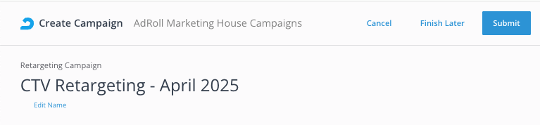 Once you're done setting your campaign, scroll up to the top of the page and click Submit. You can also click Finish Later to save your campaign as a draft.