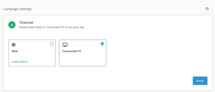 - Under Campaign Settings > Channel confirm your Retargeting Campaign should run on CTV and click Done to move to the next step. Learn more about our CTV offering here.