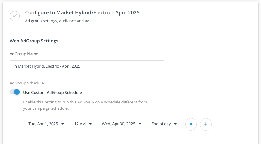 - Optionally, use a Custom AdGroup Schedule if running multiple AdGroups at different times. If toggled off the AdGroup follows the general campaign schedule.