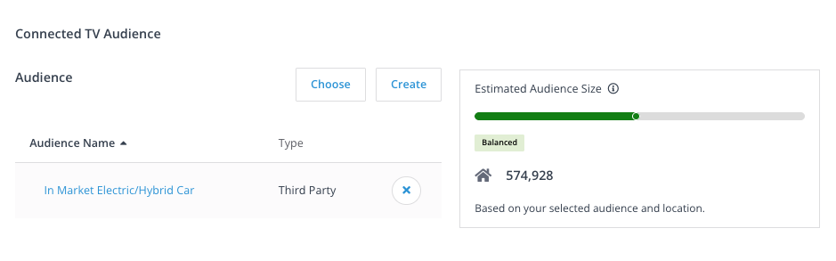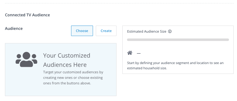 After selecting your Third Party Audience and Location filters, this widget will show you the estimated size of the number households eligible to see your CTV ads. These numbers may change over time depending on how many users do we track in your selected audience and the audience duration.