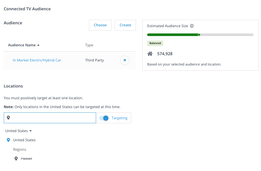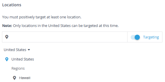 If you toggle off Locations to Manually you can choose locations within the United States, including state, city, or zip codes. In the example below we are targeting the United States, excluding the state of Hawaii.