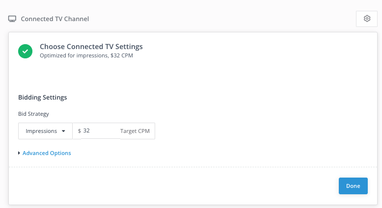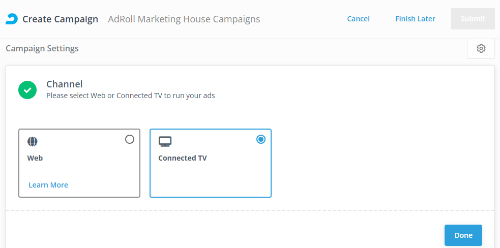 - Under Campaign Settings > Channel confirm your Third Party Audience Targeting Campaign should run on CTV and click Done to move to the next step. Learn more about our CTV offering here.