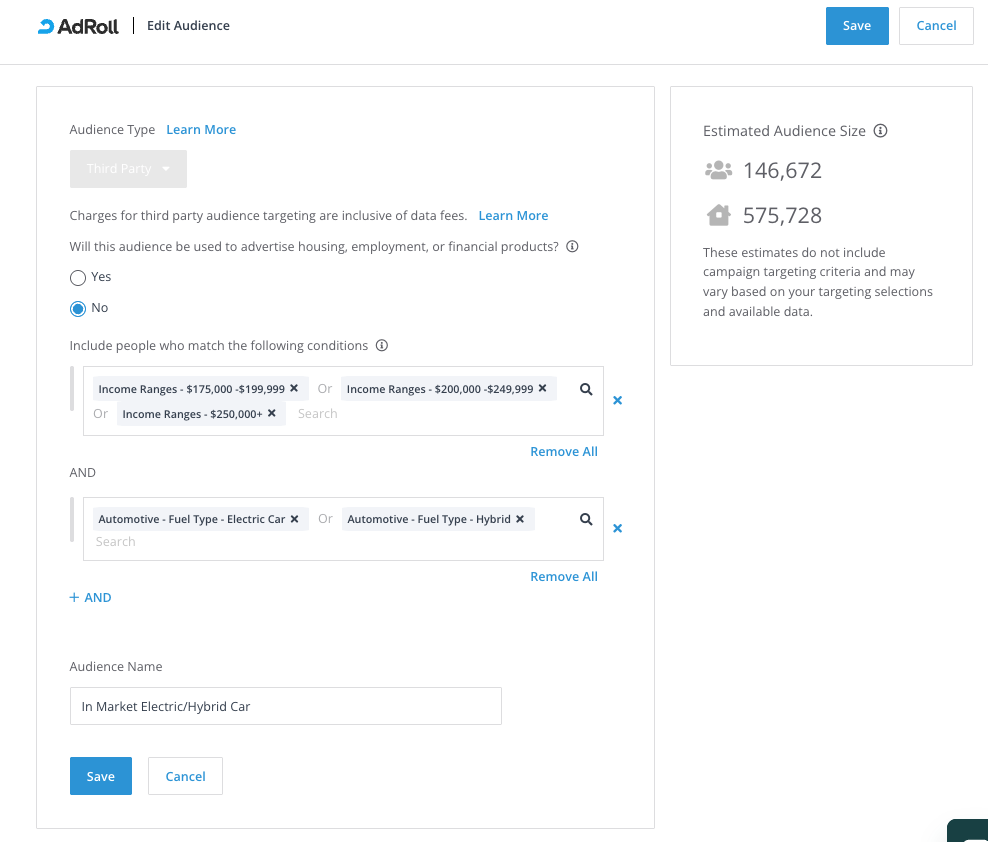 In this example, we are selecting a Third Party Audience called In Market Electric/Hybrid Car.