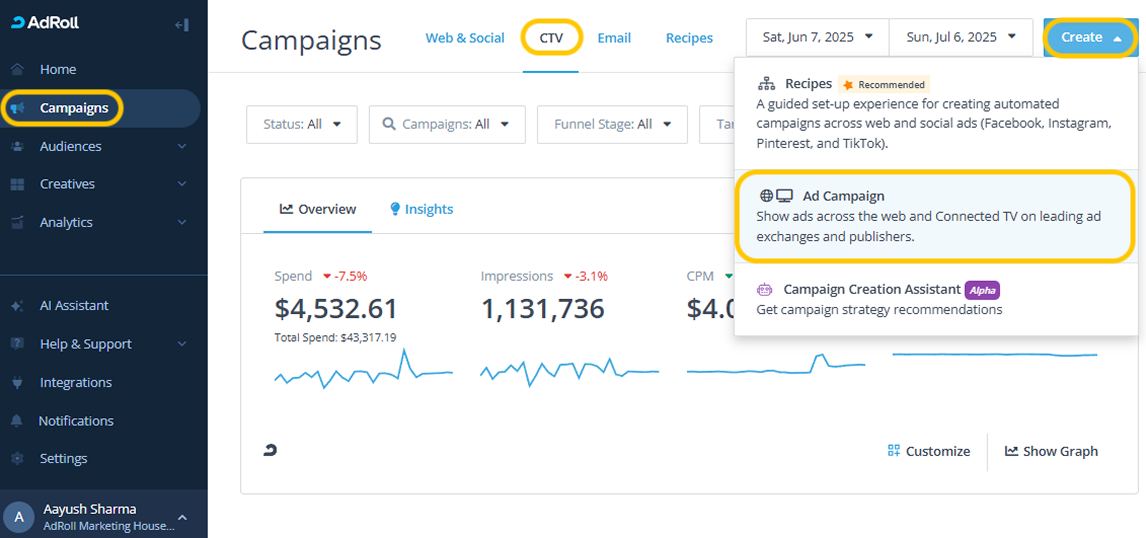 - Log in to AdRoll and go to Campaigns on the left side navigation menu.