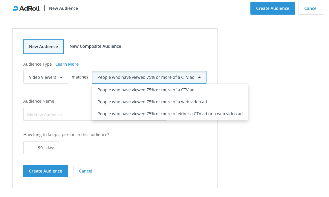 Video Viewer audiences are used to segment an audience based on people who have viewed CTV or Web video ads served through AdRoll campaigns. You can then create an audience based on the following rules,