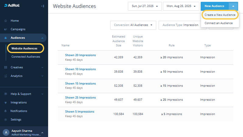 - Log in to AdRoll and navigate to the Audiences > Website Audience tab in the left navigation bar.