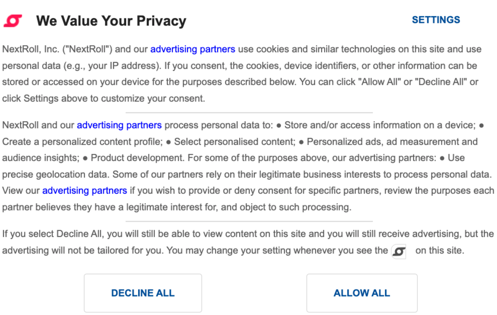 Below is how we present the notice for sites using our NextRoll Cookie Consent Banner.