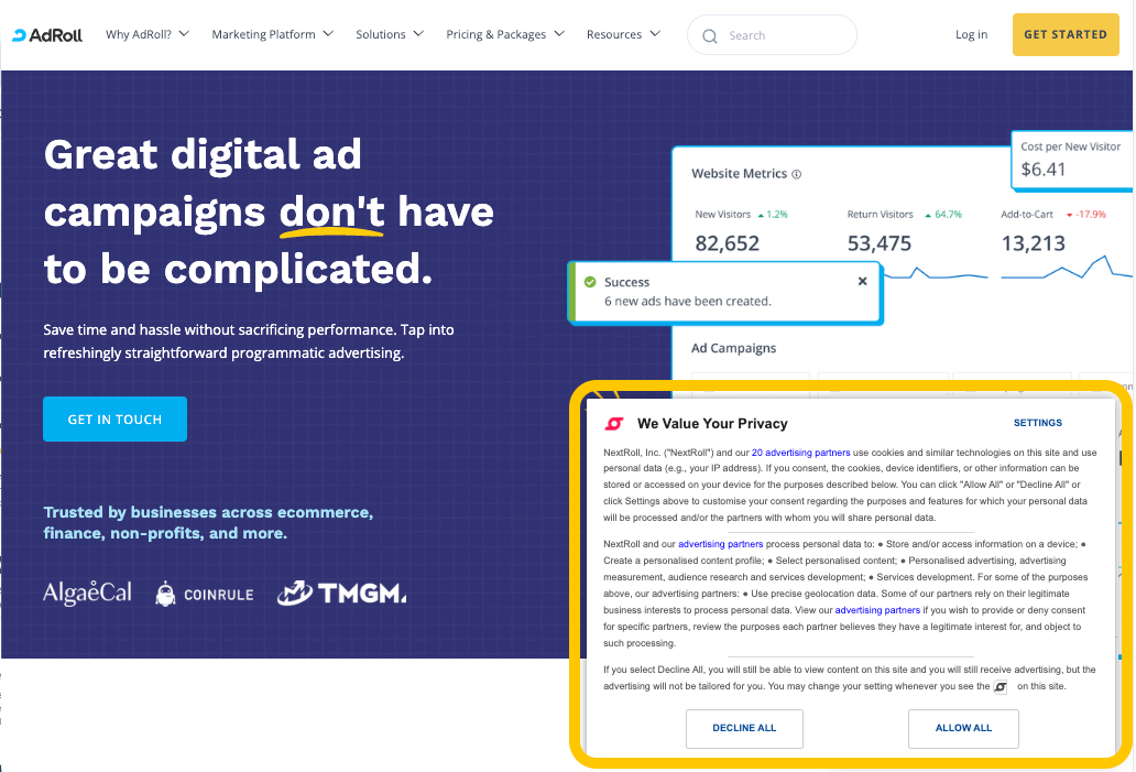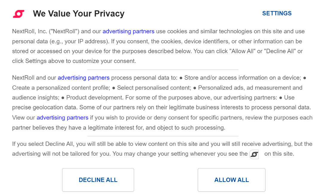 Our banner helps you comply with recent regulatory requirements for your NextRoll services and is designed to easily let your visitors know why and how cookies and other tracking technologies are used. The visitor will then have to either Allow All or Decline the tracking activity.