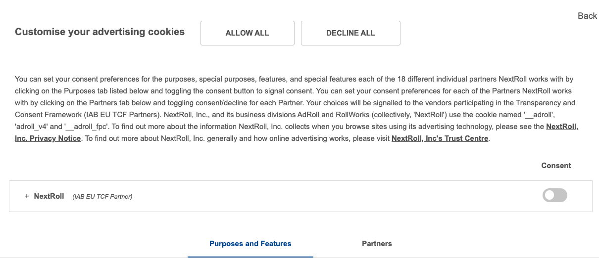 When a visitor clicks the links Advertising Partners or Settings in the banner, the visitor will see a menu to customize their ad preferences. NextRoll’s compliance with IAB TCF v2.2 framework means your visitors will have more transparency in data collection and processing activities. Visitors can exercise their consent based on Purposes and/or Partners.