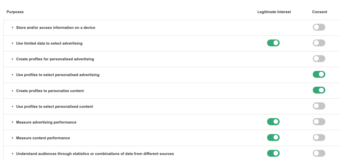 A visitor may also customize the cookies permitted based on the specific purpose of the cookie. For example, if a visitor does not want to allow a cookie to be dropped for the purpose of “creating a personalized content profile” but will allow cookies for the purpose of “selecting basic ads” then a visitor can object to the Legitimate Interest basis of collection for “creating a personalized content profile” and decline to grant consent for this purpose under the “Purpose and Features” tab of the tool. When that occurs, all partners who collect personal data for the purposes of creating a personalized content profile will either: no longer drop cookies or limit the tracking cookies dropped so as to not exercise this purpose.