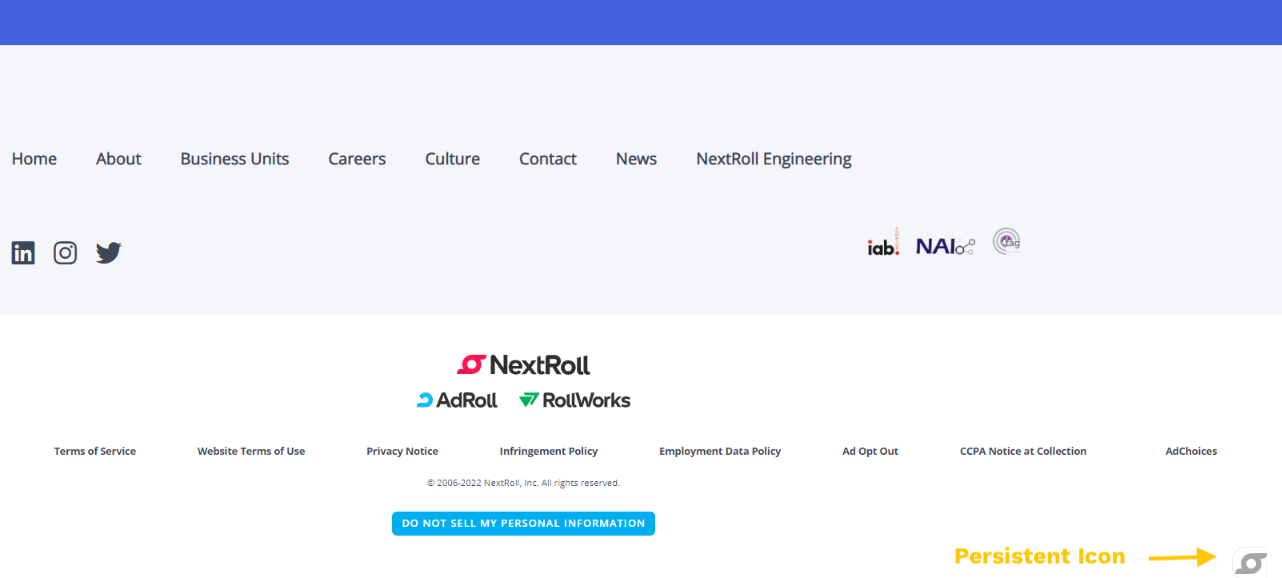 As part of following the TCF v2.2 guidelines for the NextRoll Cookie Consent Banner, the NextRoll persistent icon is located at the bottom right corner of your website near the footer of the page to enable easy access to the consent banner and its preferences to the end consumer. You cannot remove the persistent icon as it is mandatory under the new IAB TCF v2.2 guidelines.