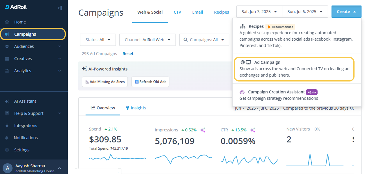 - Log in to AdRoll and navigate to Campaigns on the left side menu.