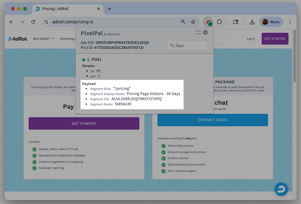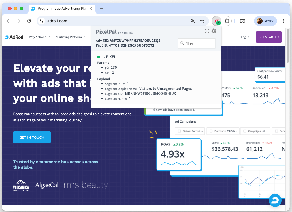 PixelPal is a Chrome extension that helps you to validate if your Pixel is implemented correctly, to ensure AdRoll is tracking your website & mobile browser's traffic, and all the audiences you defined in the AdRoll platform. Ensuring the Pixel is implemented correctly is key to ensuring your campaigns run smoothly.
