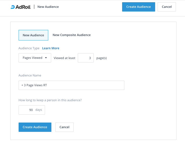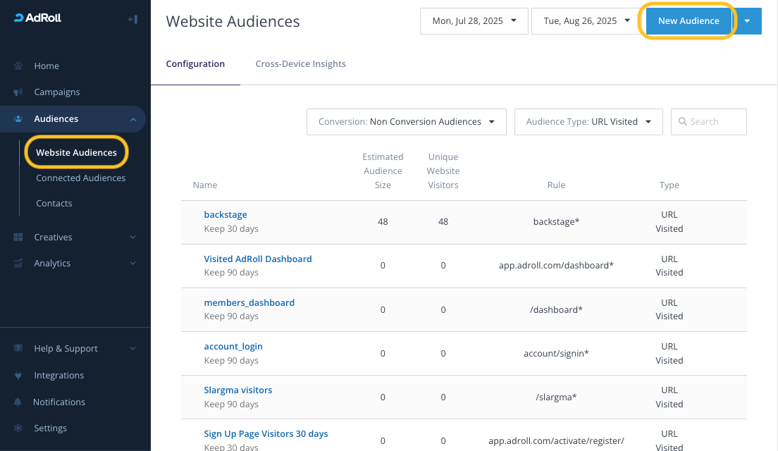 - Log in to AdRoll and navigate to Audiences > Website Audiences.