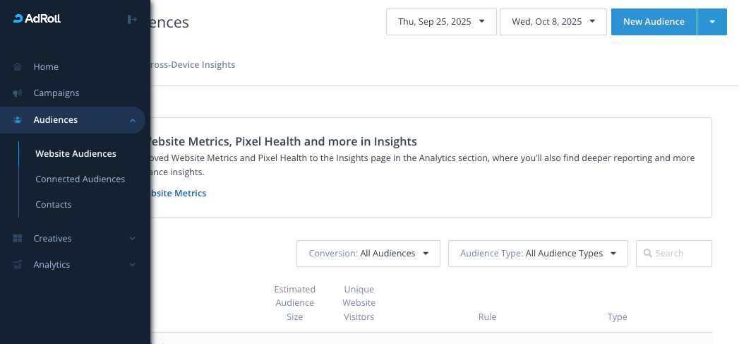 - Navigate to Audiences > Website Audiences.