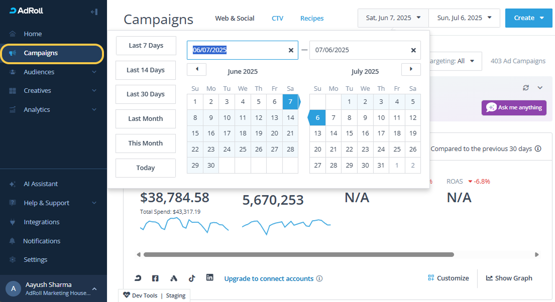 You can evaluate the performance of your campaigns and easily compare your data over a select time period by adjust the date range.