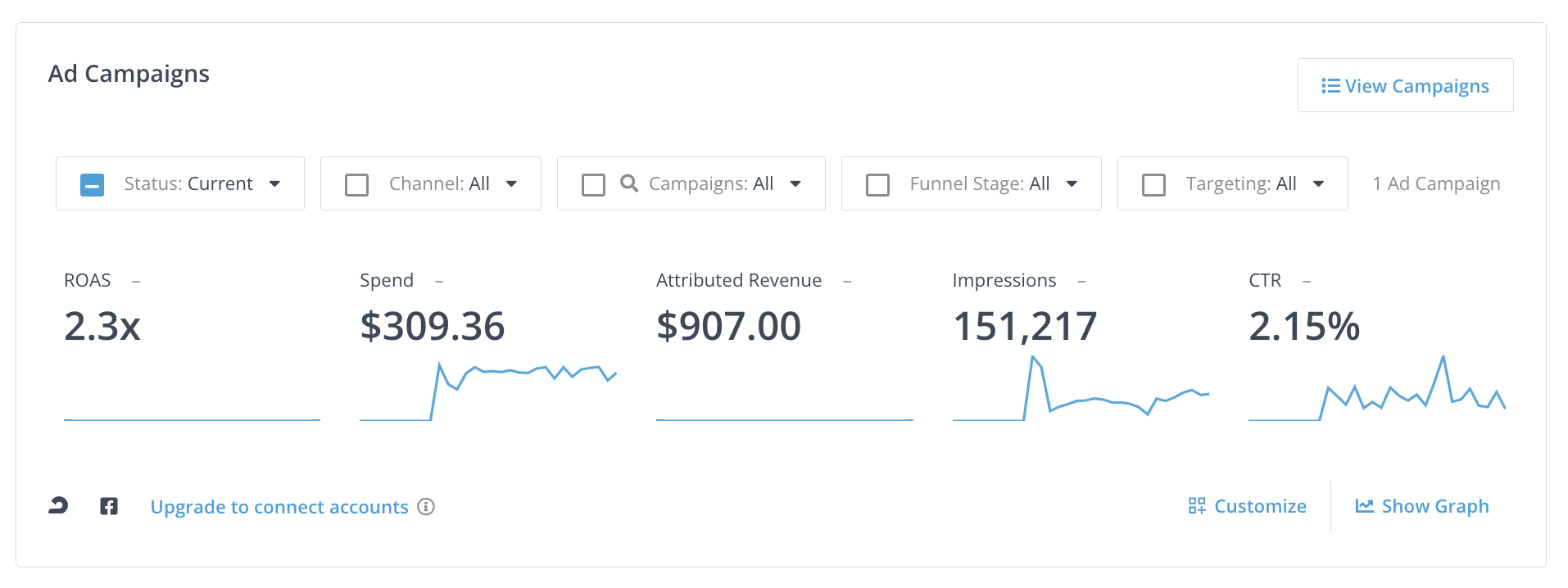 If you only have Ad Campaigns active, this tile will showcase your campaign-level performance based on the campaign (or combination of campaigns) with the most influenced conversions.