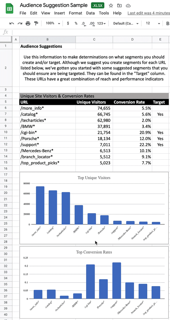 Although we suggest you create segments for each URL listed and begin testing which works best, this report will get you started with some suggested segments that you should ensure are being targeted.