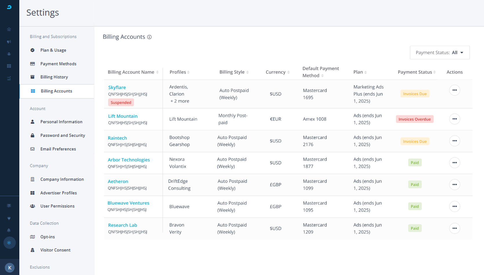- Associated Advertiser Profiles: The specific Advertiser Profiles linked to each Billing Account.