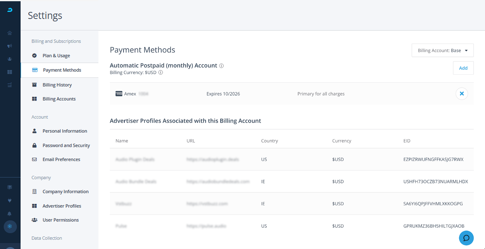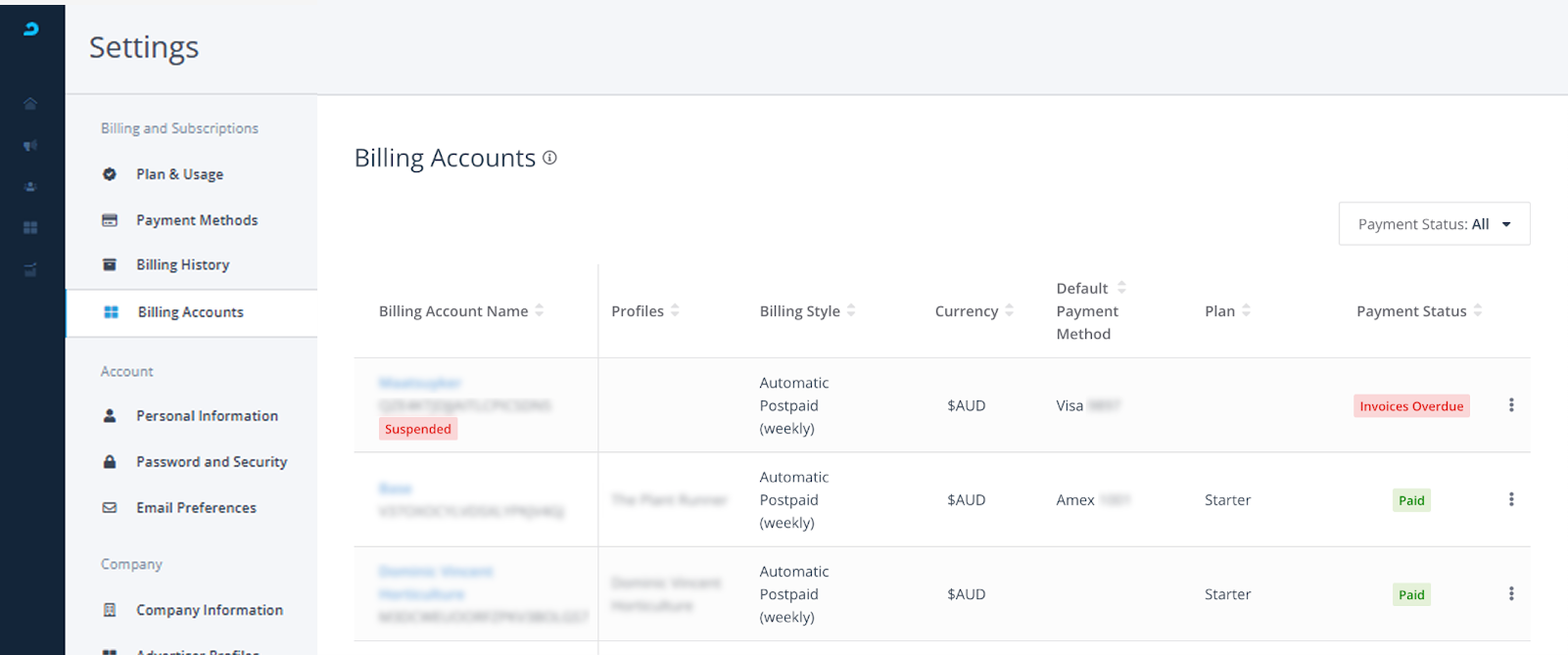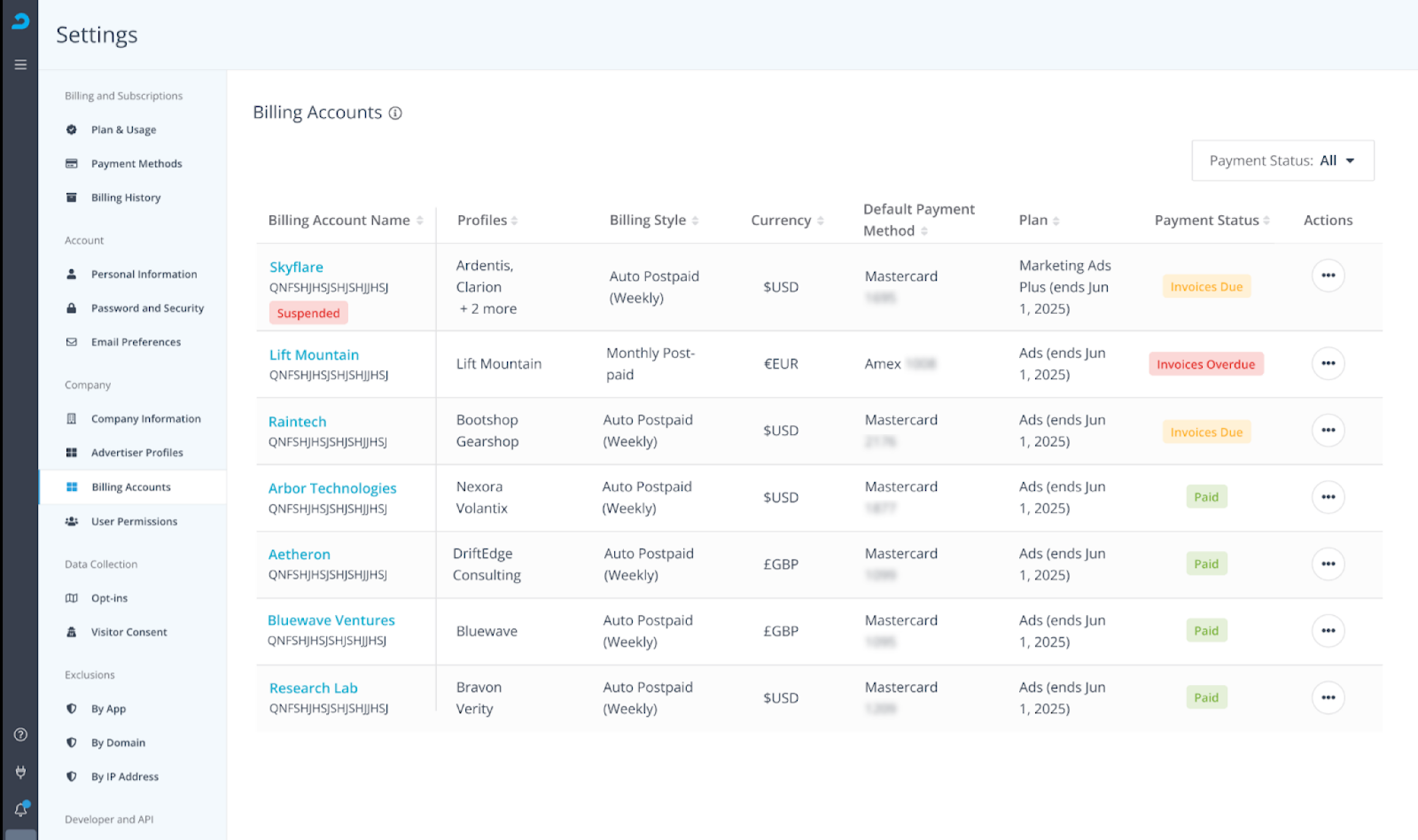 If you have multiple Billing Accounts, the Billing Account Management page gives you a centralized, clear view of how your billing is set up within AdRoll.