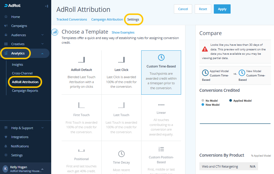 The "Compare" section on the right side of the dashboard allows you to see how different attribution models impact your reported conversions and KPIs. You can compare your "Applied Model" against a "New Model" (e.g., "Custom Time-Based" vs. "AdRoll Default") to observe potential changes.