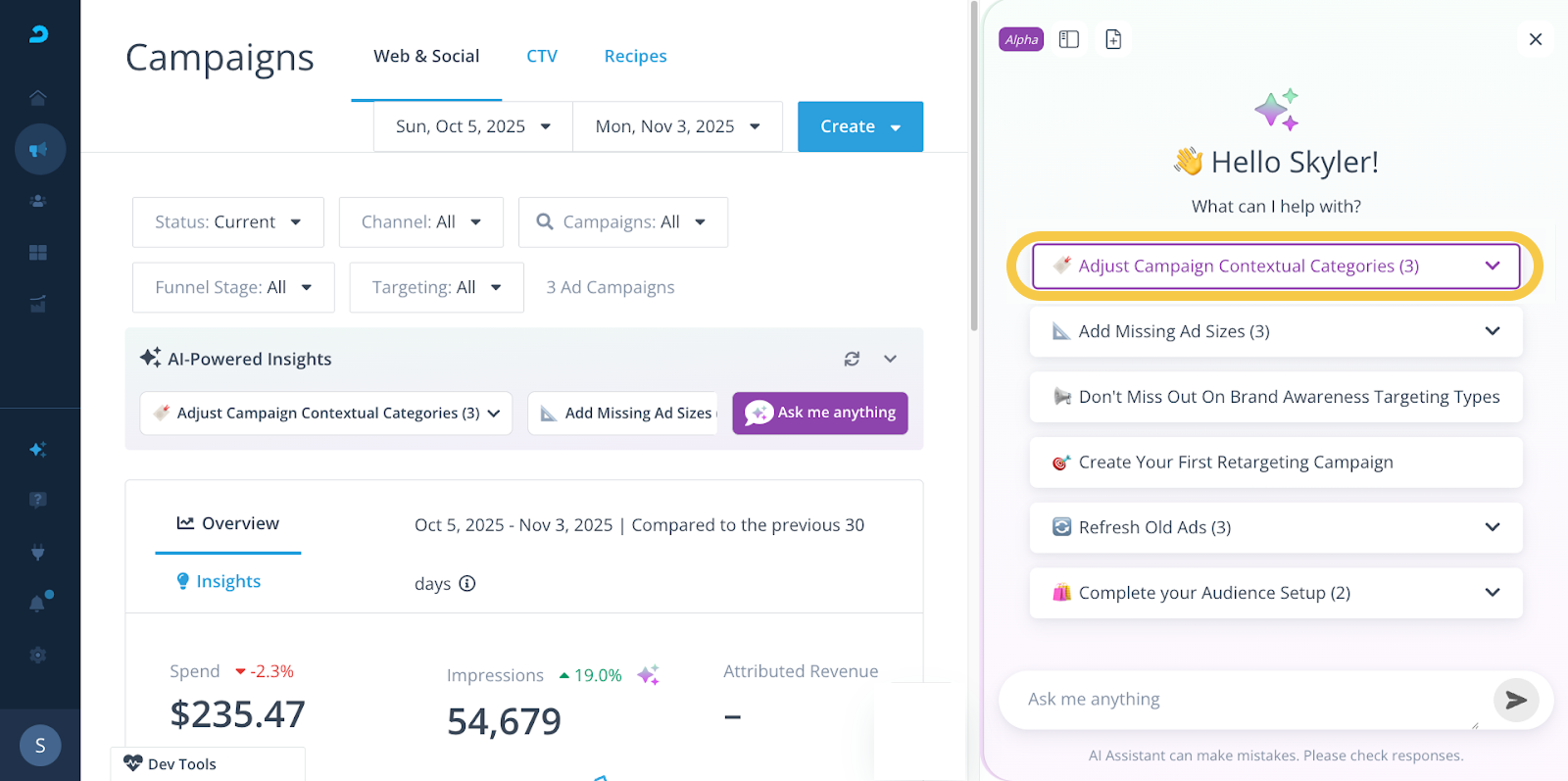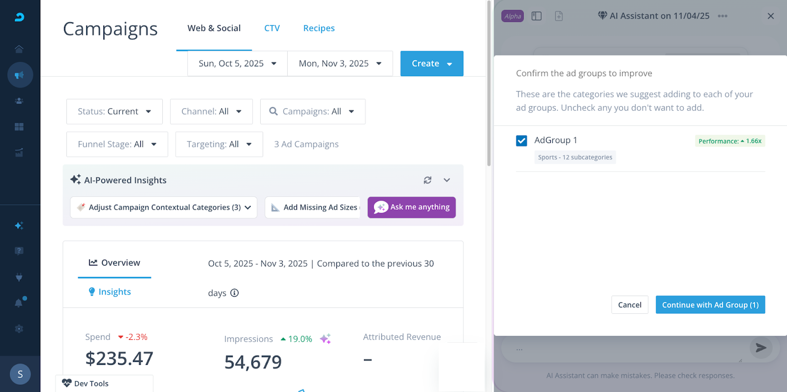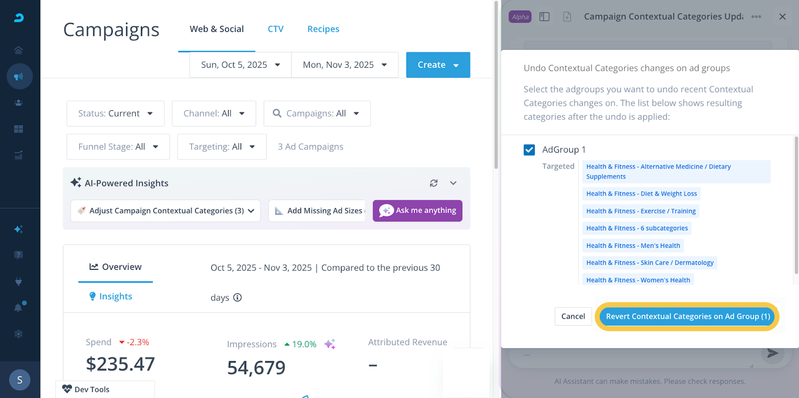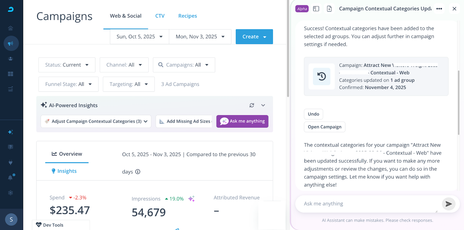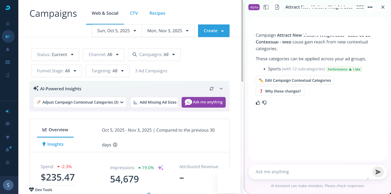 The AI Assistant evaluates campaign signals such as engagement, delivery trends, and contextual alignment to identify categories that could improve campaign performance.