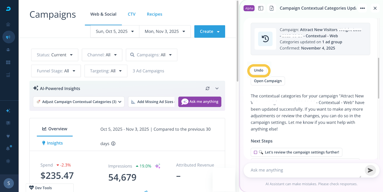 The Assistant will apply the changes to your campaign’s ad groups and confirm once complete. You can then undo changes directly from the Assistant chat or navigate to your campaign to review the updates.