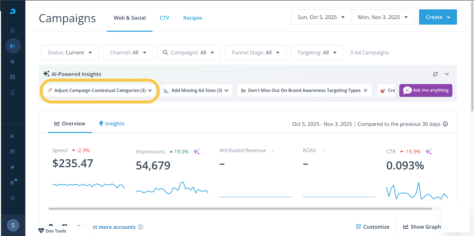 After applying contextual category optimizations, allow some time for your campaigns to begin serving impressions in the newly added categories. You can track overall campaign performance from your Campaigns tab.