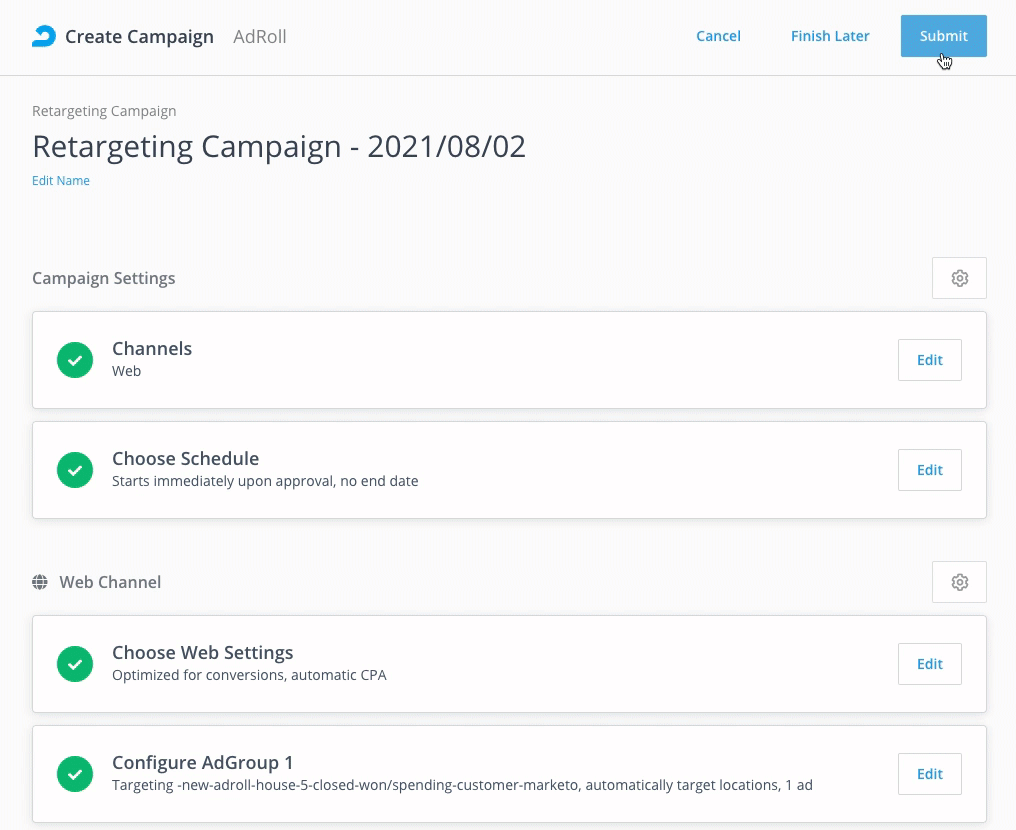 Once you're done setting your campaign, scroll up to the top of the page and click Submit. You can also click Finish Later to save your campaign as a draft. Congratulations! You have now created a retargeting campaign.