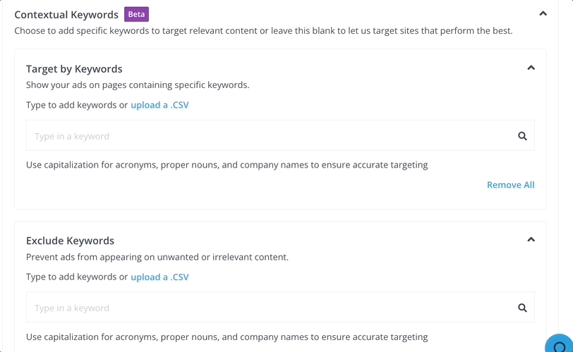 Target keywords to ensure your ads appear next to relevant content, and exclude keywords to avoid placements that don’t align with your brand. AdRoll Contextual Keywords support multilingual targeting. English keywords automatically trigger translations in 53 other languages. For more details, see Contextual Keyword Targeting.