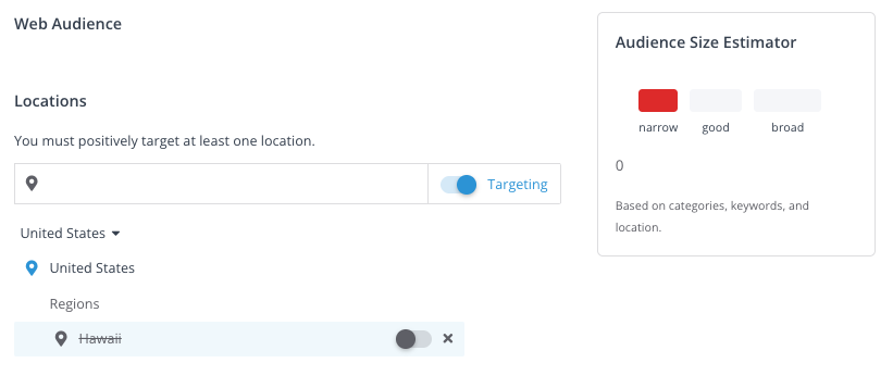 Choose your Web Audience Location by including countries, states/regions, cities, or zip codes. You can also apply exclusions. In the example below we are targeting the United States, excluding the state of Hawaii.