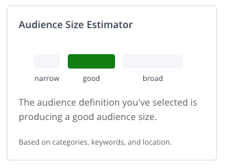 After adding content categories or keywords, the Audience Size Estimator will indicate the audience is too narrow until you continue to the next step adding categories and keywords.