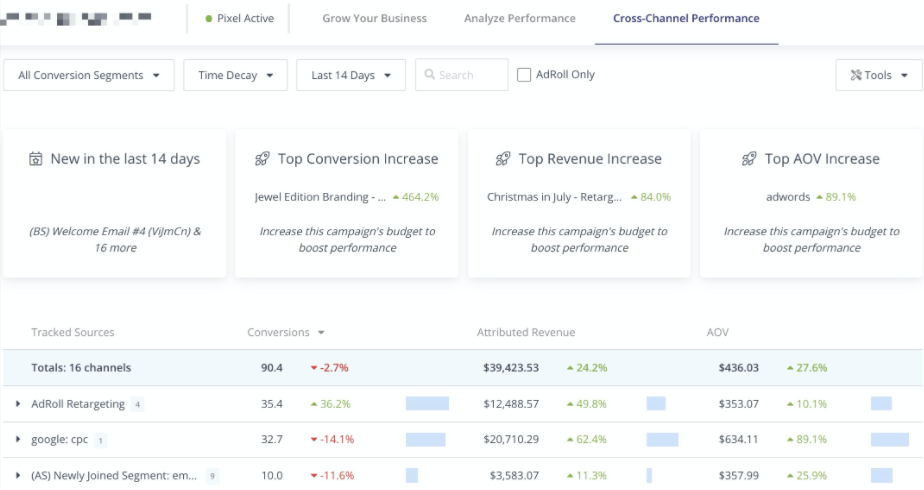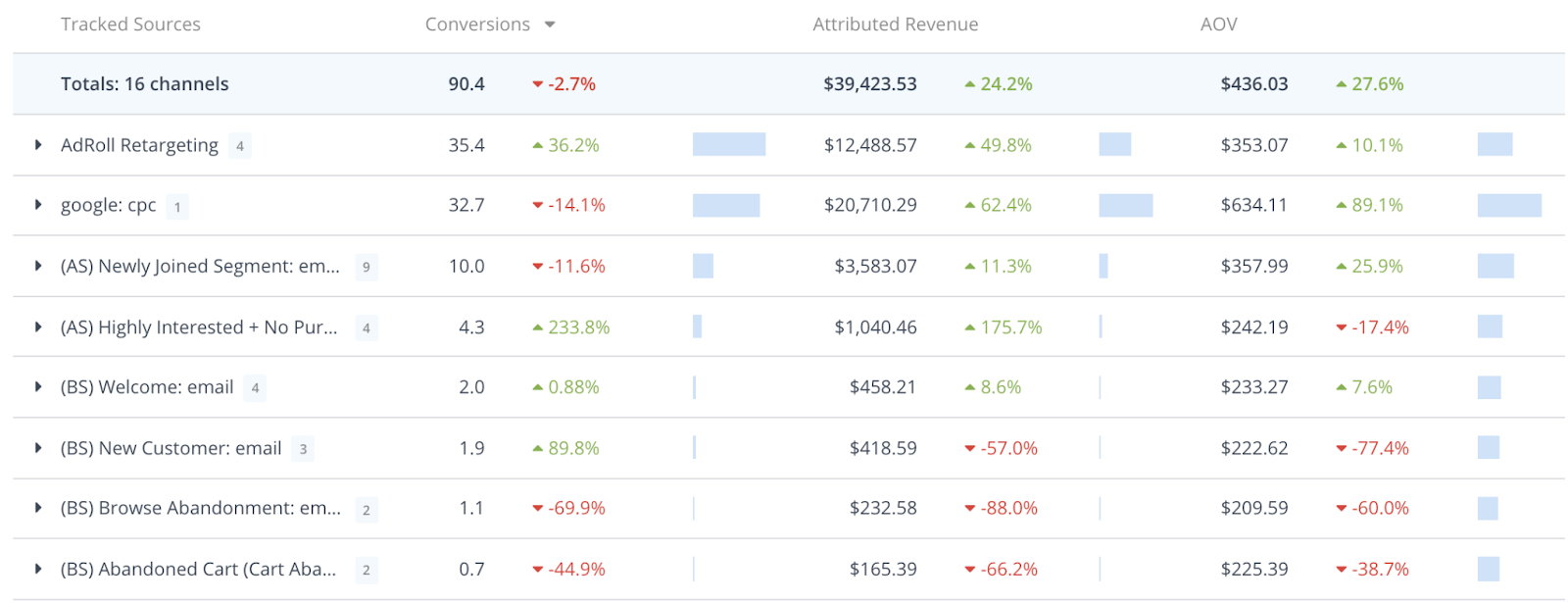 Our cross-channel performance dashboard allows you to easily review campaign and channel results with easy to read visuals including charts and graphs. These metrics include conversion, revenue, and AOV metrics across their entire marketing stack.