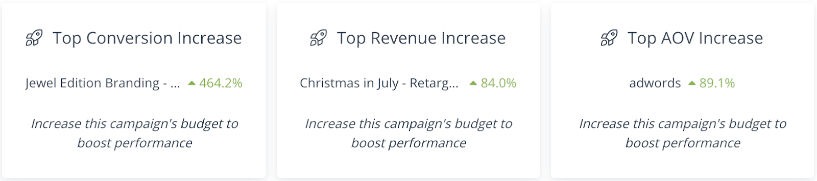 We will recommend budget increases and decreases to improve overall conversion and revenue activity per campaign. This lets you understand your campaign performance and quickly capitalize on trends to get the most ROI.