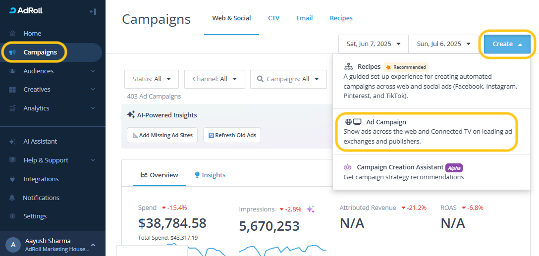 - Log in to AdRoll and navigate to Campaigns on the left side menu.