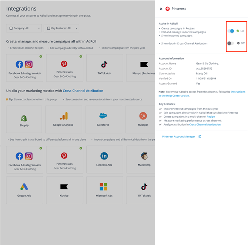 If you would like to no longer see any data from this channel in AdRoll, you can navigate to the Integrations page and turn the integration “off”.